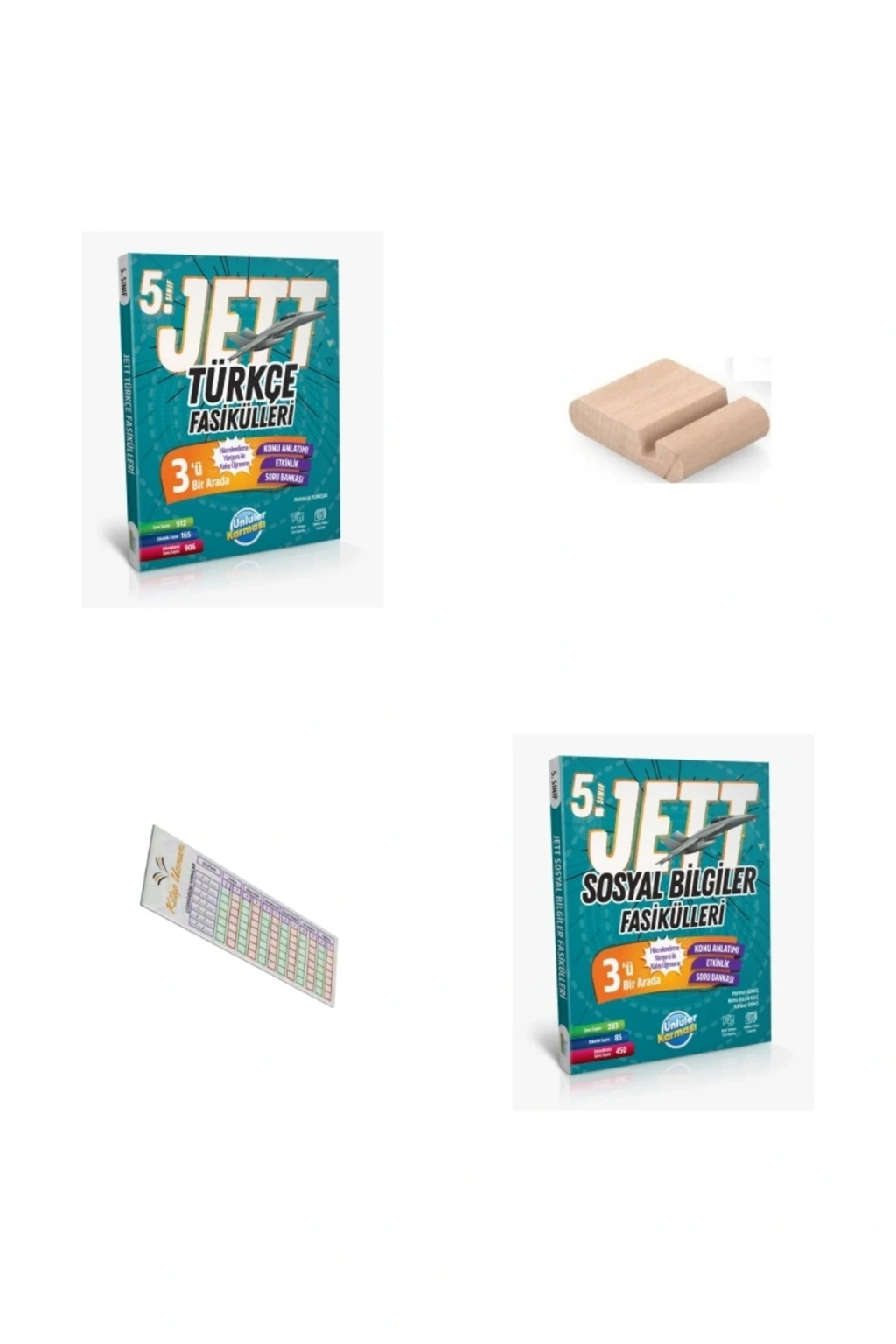 Ortaokul öğrencilerinin sınav başarısını artırmak amacıyla hazırlanan 5. Sınıf Jett Fasikülleri, Ünlüler Karması Yayınları’nın titiz çalışmalarıyla sunuluyor.; Hem konu anlatımı hem de soru bankası mantığını bir arada bulunduran bu fasiküller, öğrencilerin dersleri daha kolay anlamasına ve konuları pekiştirmesine yardımcı oluyor.; ?5. Sınıf Jett Fasiküllerinin AvantajlarıKonu Bazlı Anlatım: Her fasikül tek bir konuya odaklanır.; Öğrenciler eksik oldukları bölümleri kolayca çalışabilir.; MEB Müfredatına Uygun: Türkçe, Matematik, Fen Bilimleri ve Sosyal Bilgiler gibi tüm dersler güncel müfredatla uyumludur.; Çözümlü ve Test Soruları: Konu sonunda yer alan sorular sayesinde öğrenci öğrendiğini pekiştirir, çözümlü sorularla öğrenme kalıcı hale gelir.; Sınavlara Hazırlık: Hem okul yazılılarına hem de ilerideki LGS hazırlık sürecine güçlü bir temel oluşturur.; ? Kimler İçin İdeal?5. sınıf öğrencileri,Yazılılara hazırlananlar,LGS öncesinde sağlam bir altyapı kurmak isteyenler,Öğretmenler ve etüt merkezleri.; ? Ünlüler Karması Yayınları 5. Sınıf Jett Fasikülleri, düzenli çalışma alışkanlığı kazandırır, öğrencilerin konuları kolayca öğrenmesine yardımcı olur ve sınavlarda başarıyı artırır.